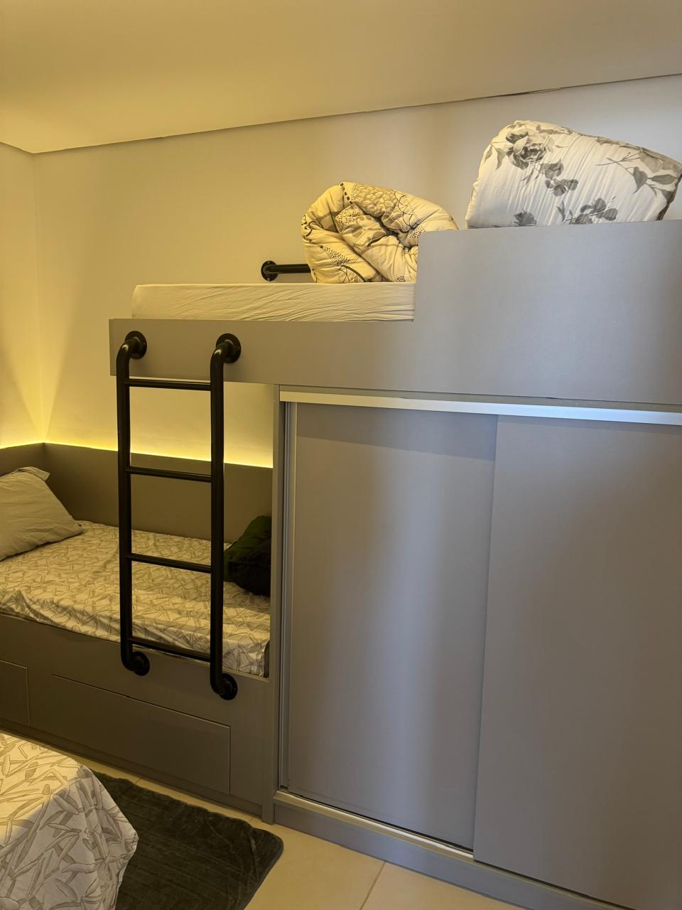 🛏️ Dormitório de solteiro com camas e box com baú, proporcionando mais espaço para armazenamento