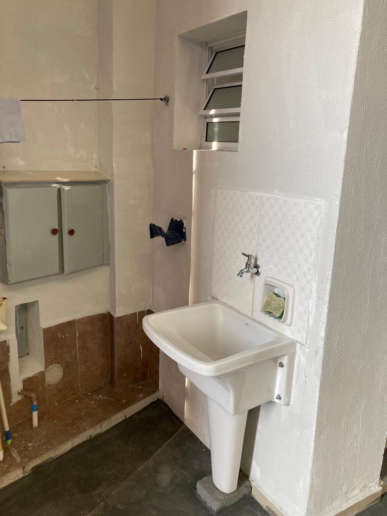 -Imóvel com pé-direito de 7 metros, mezanino, 2 banheiros, escritório, cozinha e tanque de louça.